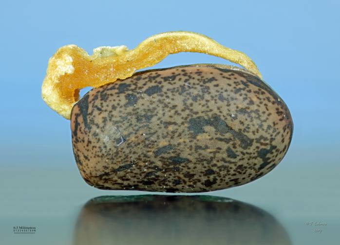 Semillas de c. 5 x 3 mm, elipsoideo-comprimidas, lisas, mates, grises, densamente salpicadas de manchas y puntos negros. Hilo muy largo, linear, ligeramente cuneiforme, c. 7 veces más largo que ancho, dispuesto casi a lo largo de toda a cara ventral de la semilla y ocupando c. 1/3 de su circunferencia total. Lens apenas destacado con su elevación central situada a c. 1 mm del hilo. Funículo adherido al extremo micropilar del hilo.